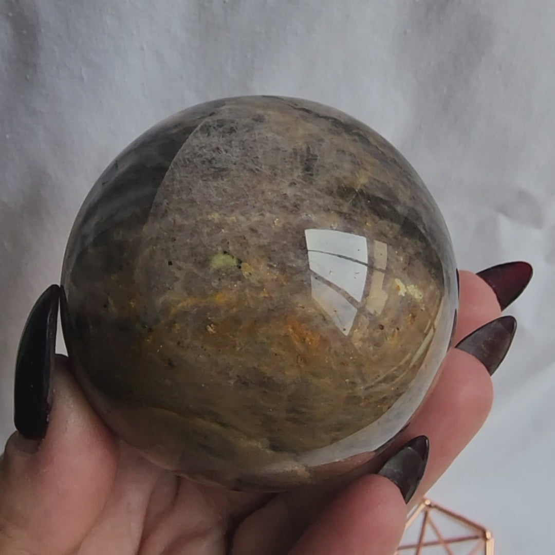 This Black Moonstone Sphere with its gorgeous golden healer inclusions is such a special piece. It’s like holding a little universe of calm and quiet strength in your hands.